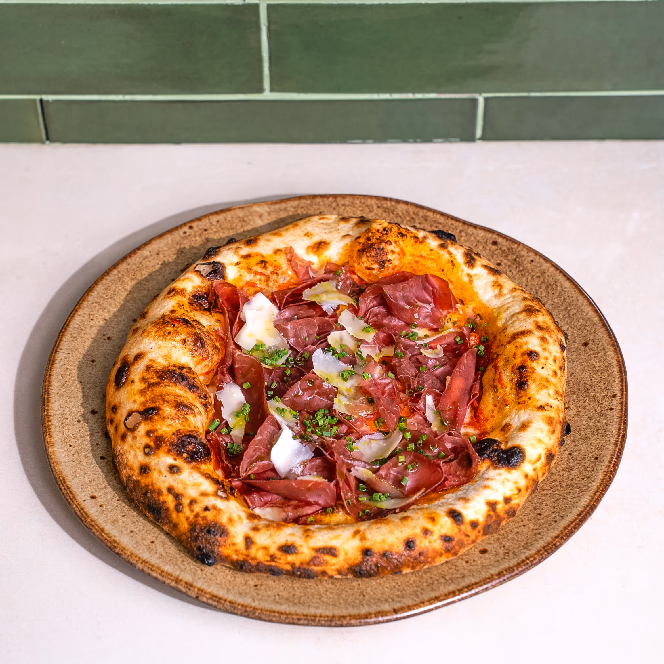 Signature Neapolitan sauce, Bresaola, Mozzarella cheese, Idiazabal cheese , chives, togarashi, basil oil