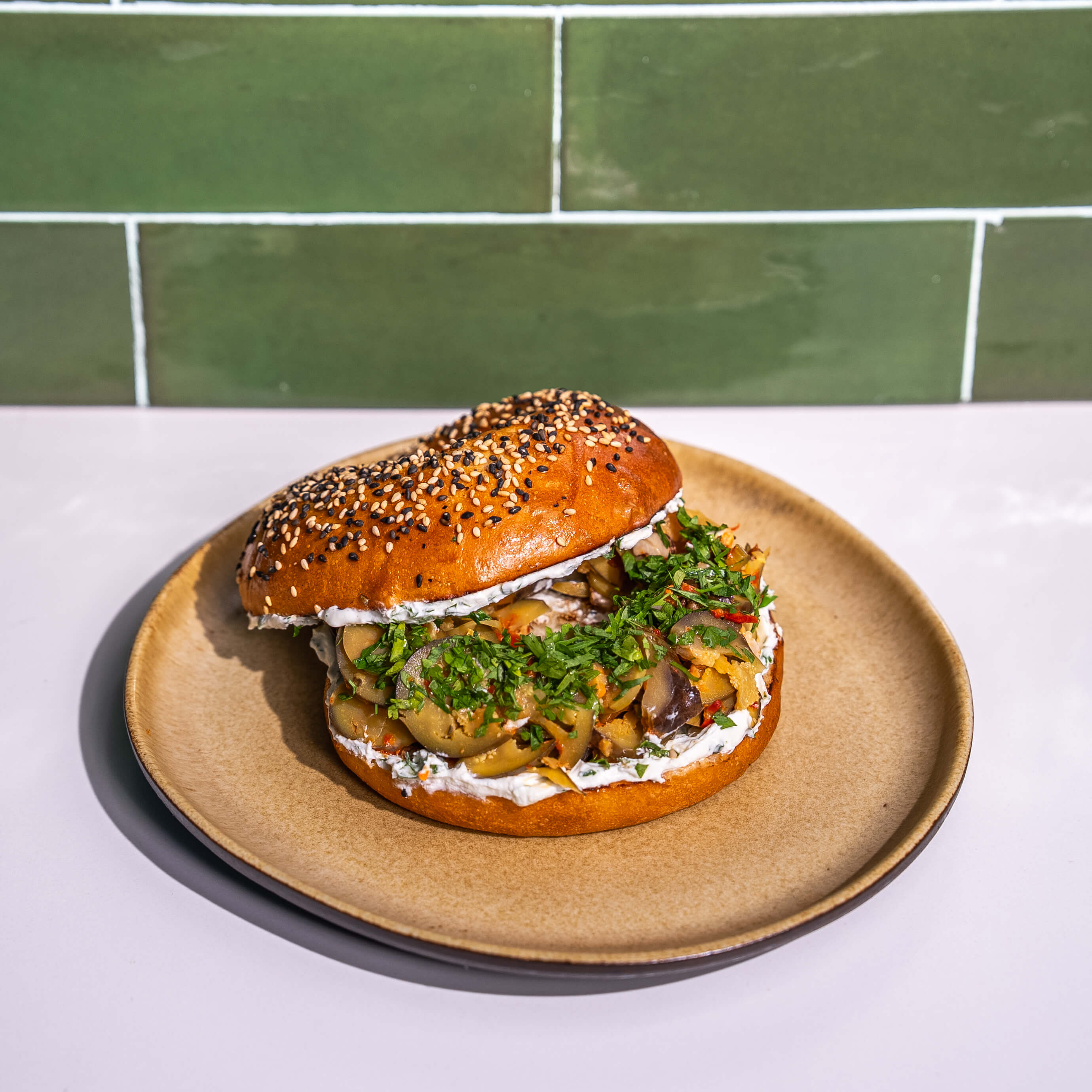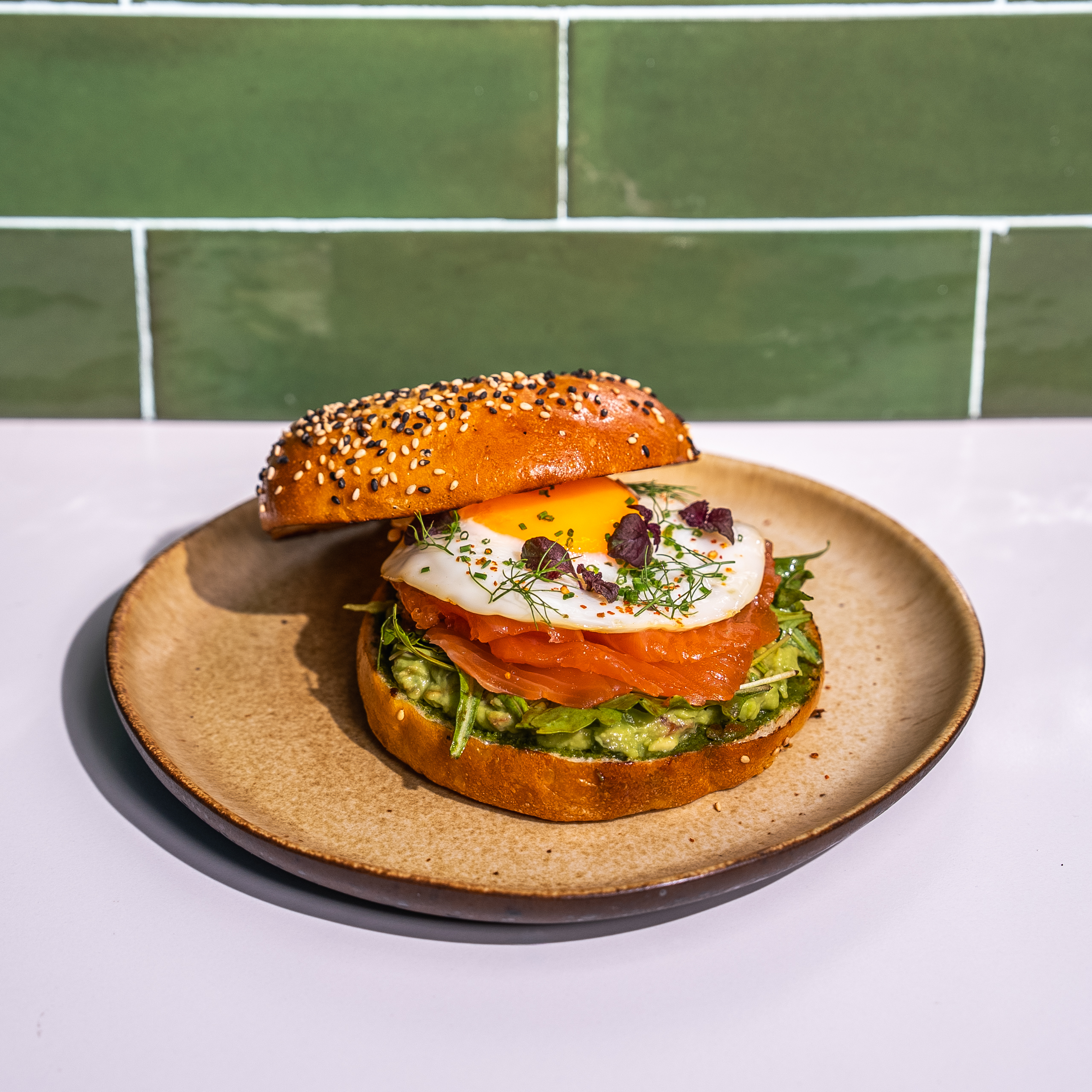 Brioche Bagel, Pesto Sundried Sauce, Guacamole, Rocket Leaves, Pomegranate Molasses, Smoked Salmon, Egg, Togarashi, Micro Shiso, Dill Leaves And Chives